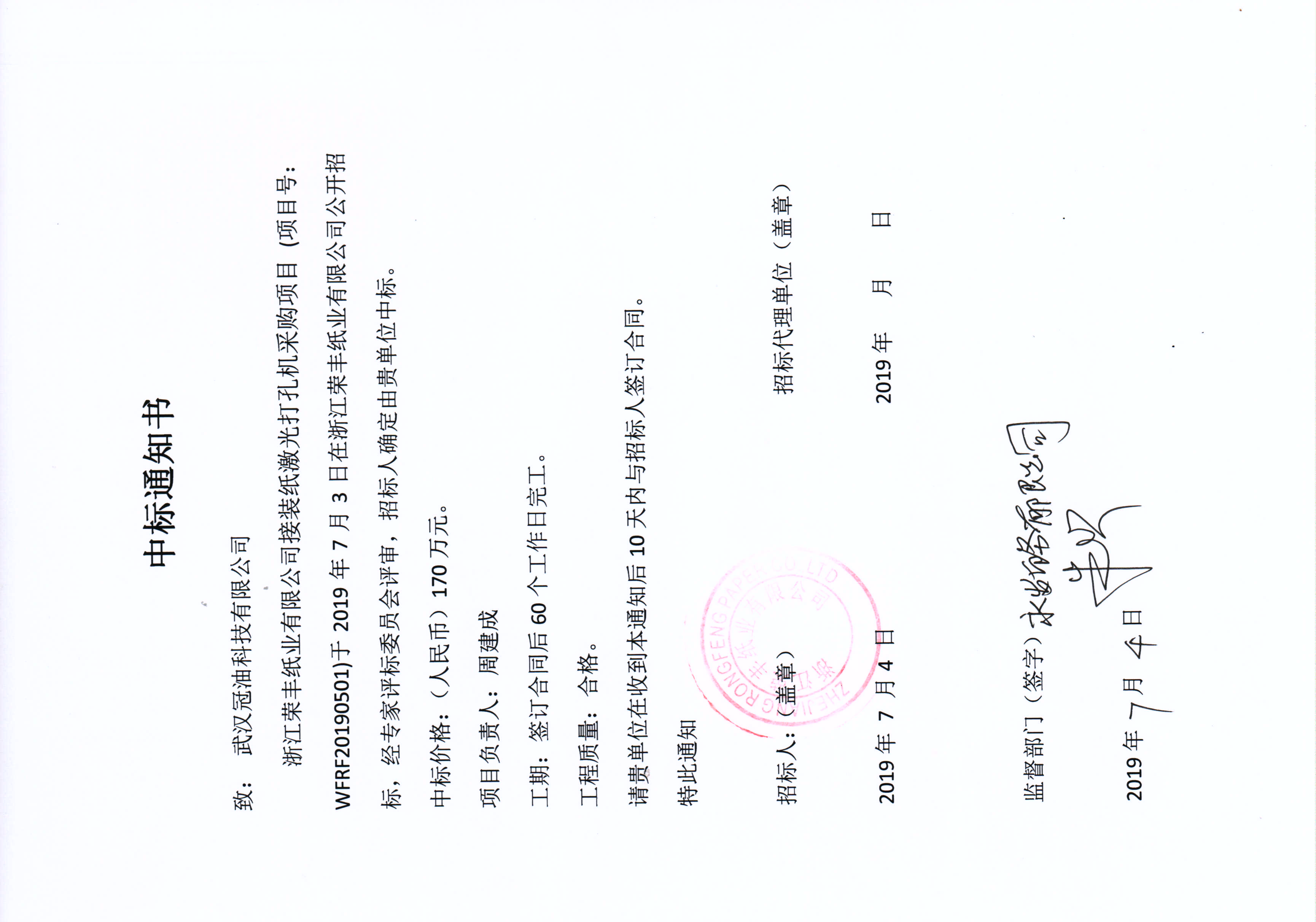 浙江榮豐紙業有限公司接裝紙激光打孔機采購項目(項目號:WFRF20190501)于2019年7月3日在浙江榮豐紙業有限公司公開招標,經專家評選委員會評審,招標人確定由《武漢冠油科技有限公司》單位中標。具體詳見附件:《中標通知書》